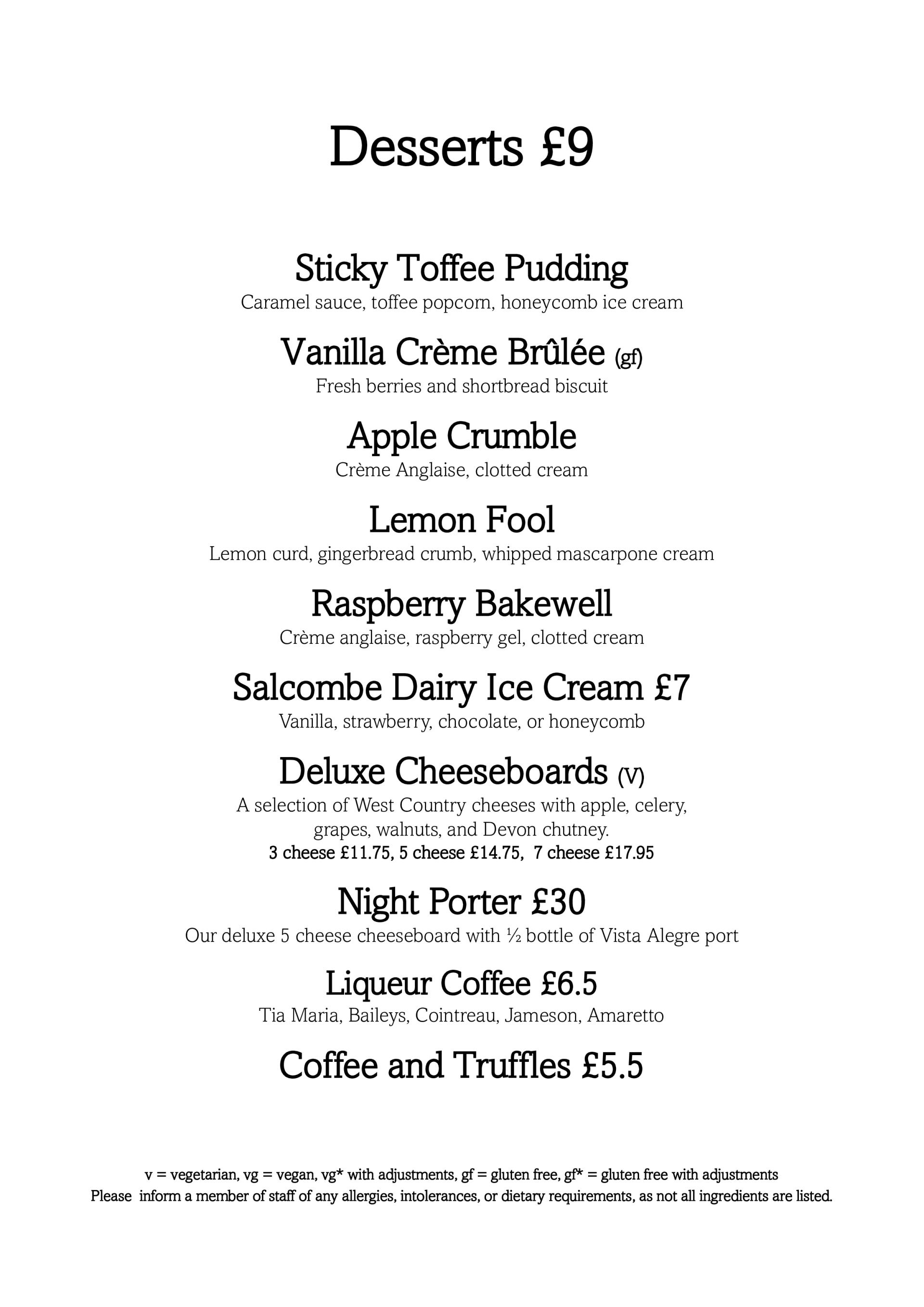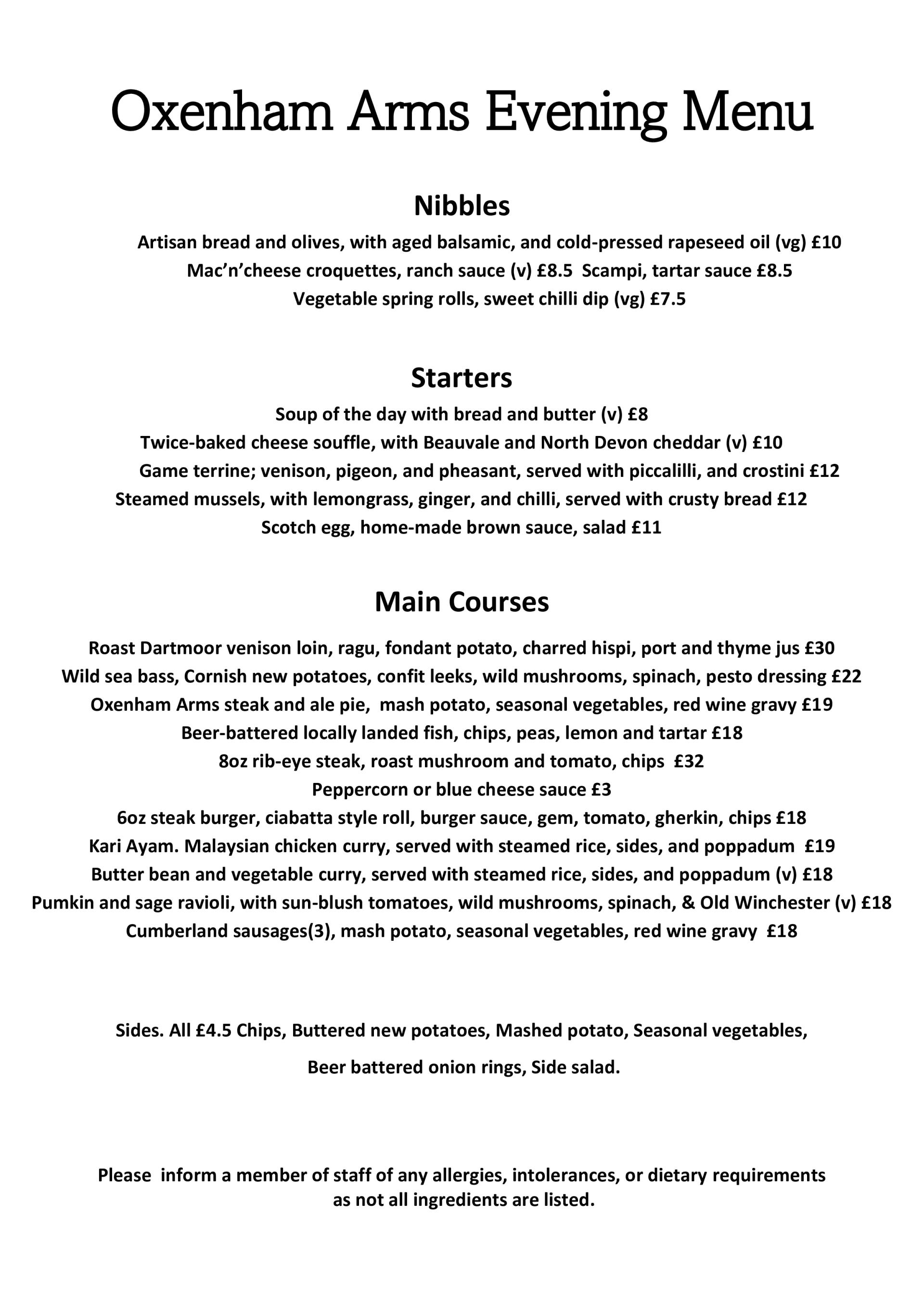 The Oxenham Arms Hotel AA Rosette Evening Dinner Menu